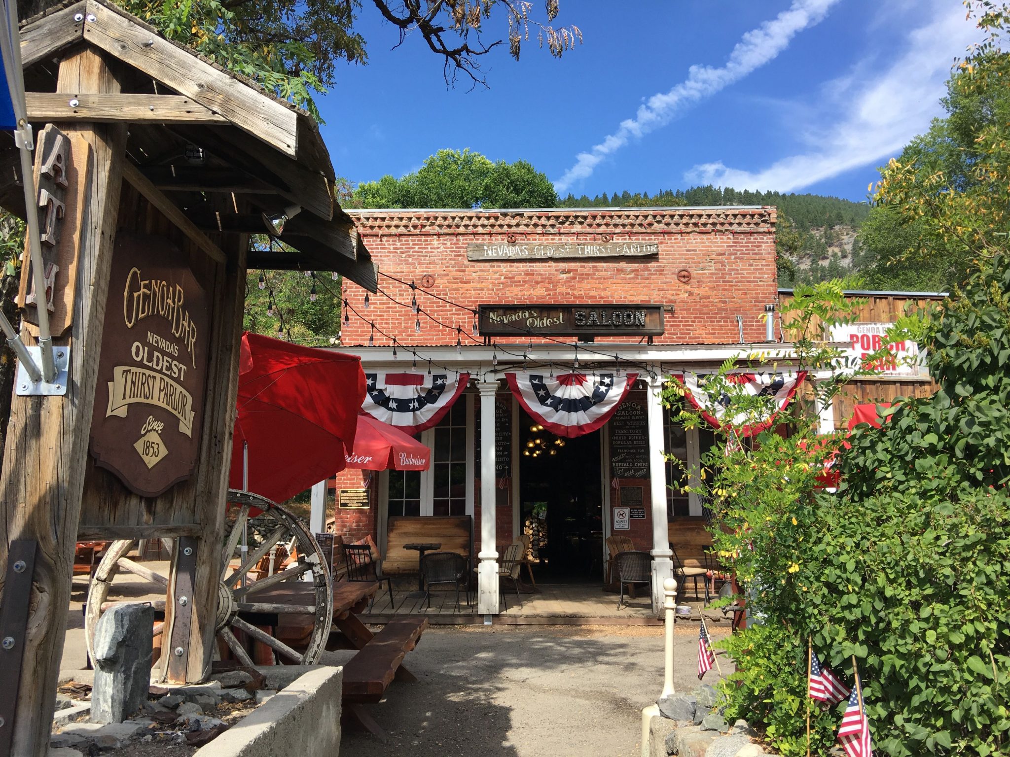 そしてその隣にあるのがネバダ州最古の酒場である Genoa Bar and Saloon。創業1853年。時代を感じる煉瓦造りの建物が真のアーリーアメリカンです。庭には今も使われているレトロなストーブがありMr. Moonshineと名付けられてて名物フォトオブジェになってます。小さな村だけど24時間営業してます!